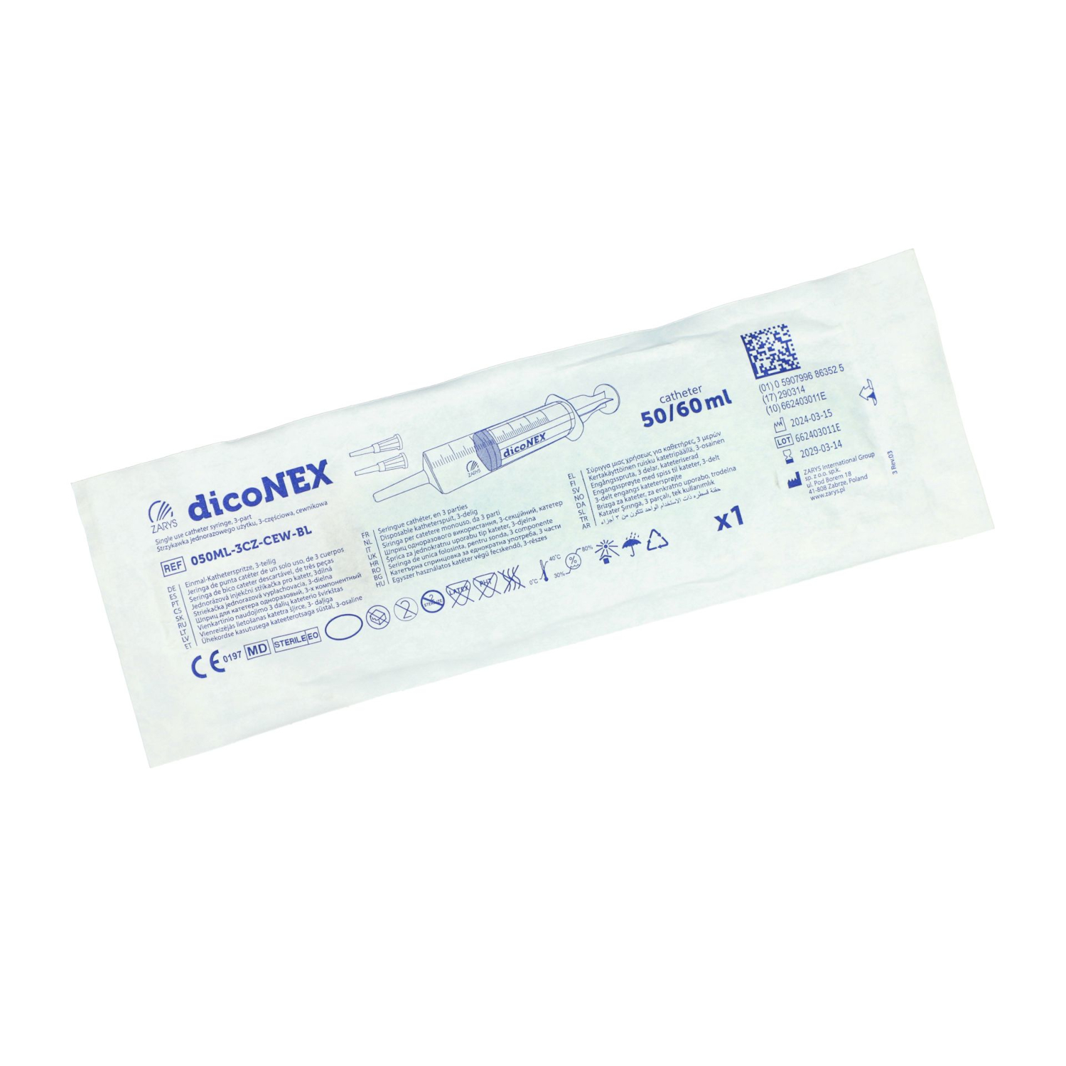 Strzykawka cewnikowa dicoNEX 50 ml przeznaczona jest przede wszystkim interakcji z różnego typu cewnikami, od urologicznych po sondy do karmienia. Nadaje się do napełniania baloników w cewnikach Foley'a i przepłukiwania pęcherza moczowego. Pozwala także podawać pożywienie pacjentom poprzez sondę żołądkową (zgłębnik) lub cewnik do karmienia.Może być stosowana także do pobierania i podawania płynów oraz do pobierania próbek płynów ustrojowych w warunkach szpitalnych i ambulatoryjnych.