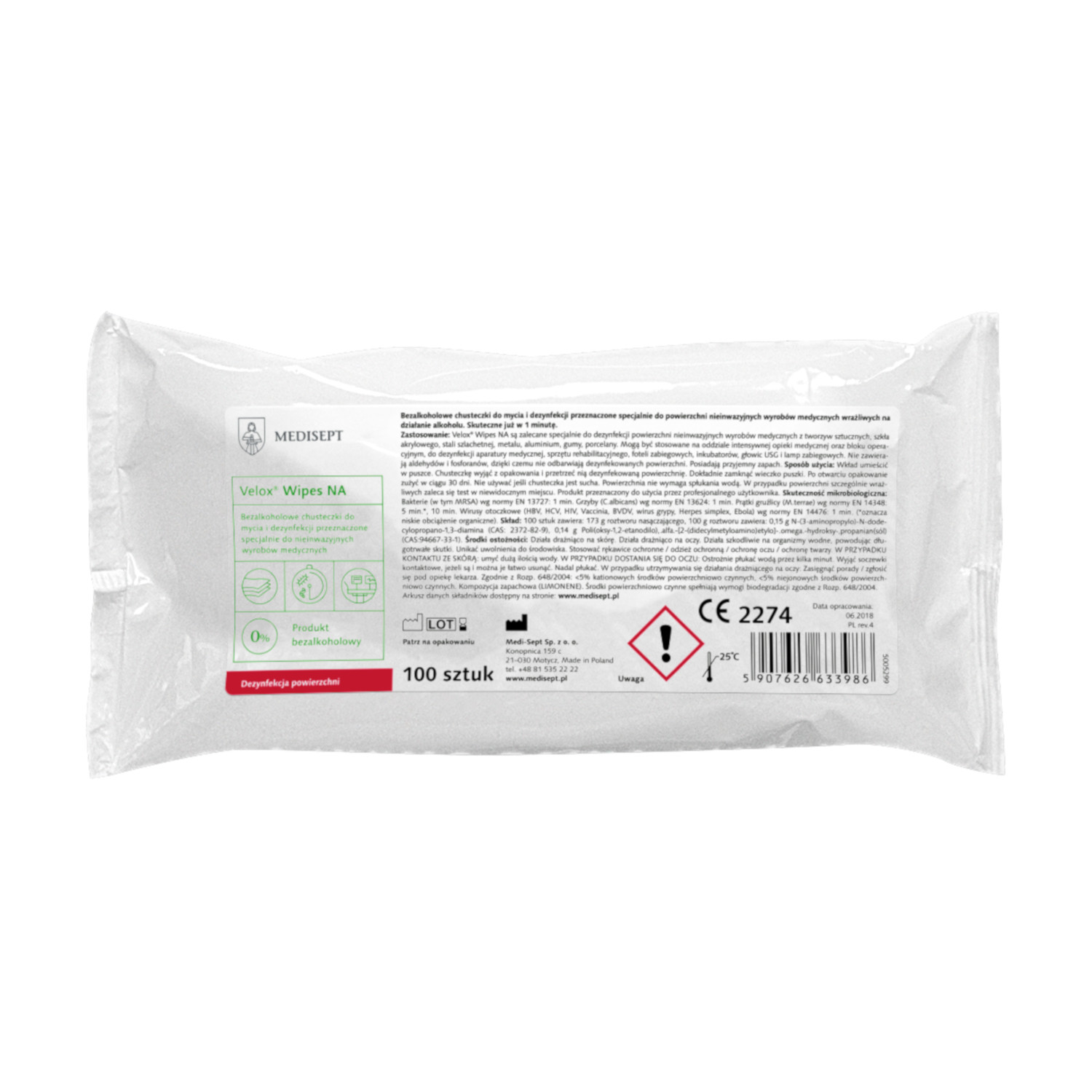 - Velox Wipes NA to gotowe do użycia, bezalkoholowe chusteczki w rozmiarze 13×20 cm do dezynfekcji powierzchni i wyrobów medycznych.