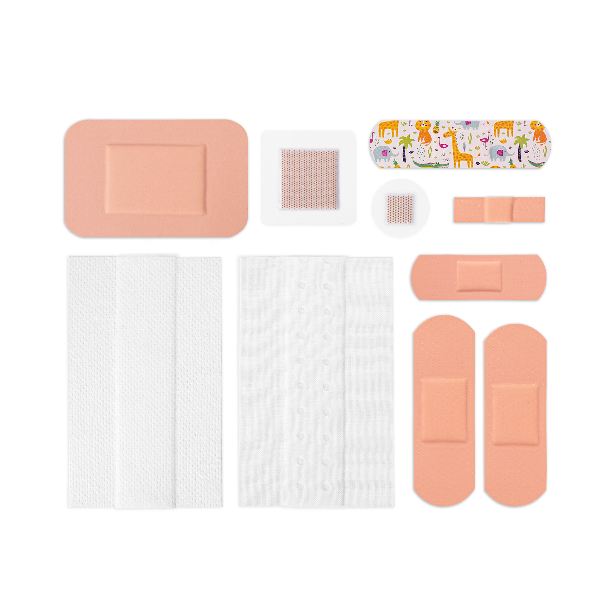 Zestaw 28 plastrów różnej wielkości,w tym także foliowych i z kolorowym nadrukiem, specjalnie dla dzieci.
